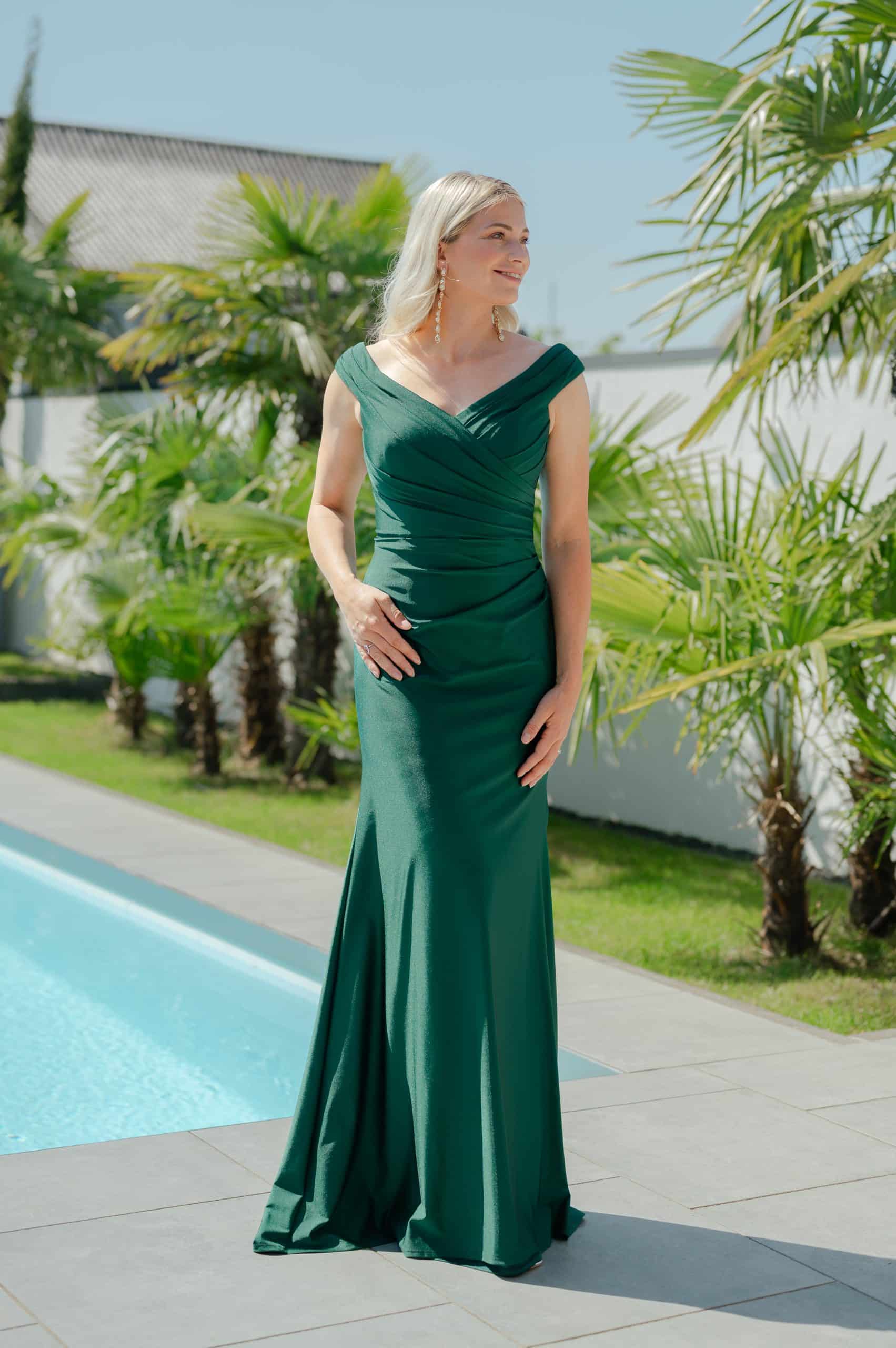Lass deinen Auftritt stilvoll erstrahlen – mit dem eleganten Alisa-Kleid in tiefem Smaragdgrün. Dieses schmeichelhafte Kleid eignet sich hervorragend für Brautjungfern, die einen zeitlosen, femininen Look mit modernem Twist suchen. Alisa präsentiert sich in einem wunderschönen Off-Shoulder-Design mit schmeichelhaf gerafften V-Ausschnitt, der dezent das Décolleté betont. Die figurbetonte Taille und die asymmetrischen Drapierungen schaffen eine elegante Silhouette, die jede Figur perfekt in Szene setzt. Der weiche Stretchstoff fällt sanft über die Hüften und mündet in einen figurbetonten, leicht ausgestellten Rock mit fließender Bewegung.