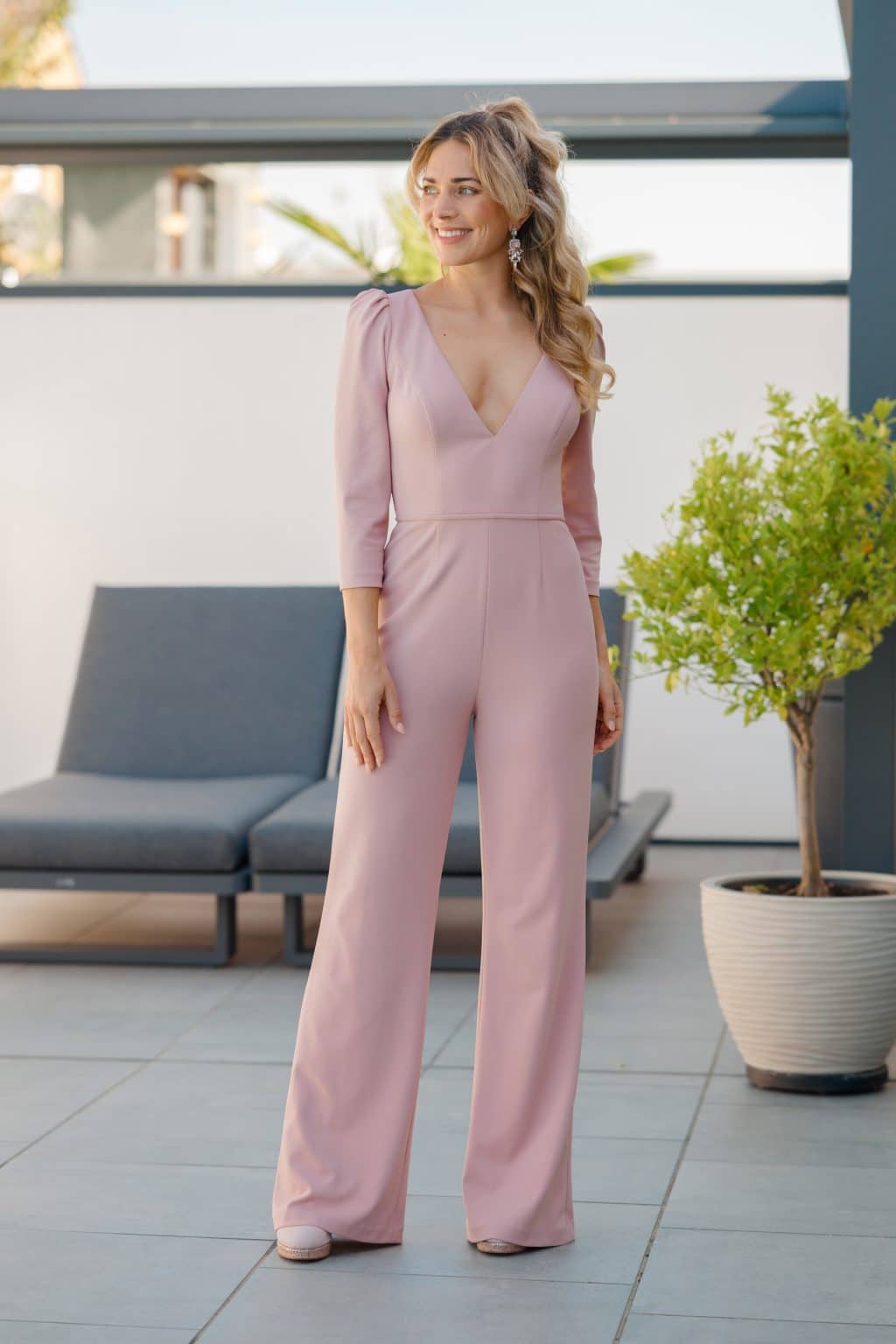 Wer sagt denn, dass Brautjungfern nur Kleider tragen? Der Aphrodite-Jumpsuit ist dein Go für modischen und bequemen Auftritt mit einer weiblichen Note. Der tiefe V-Ausschnitt, spielerische Puffärmel und offener Rücken sorgen für einen Wow-Effekt, von der Zeremonie bis zur Tanzfläche.