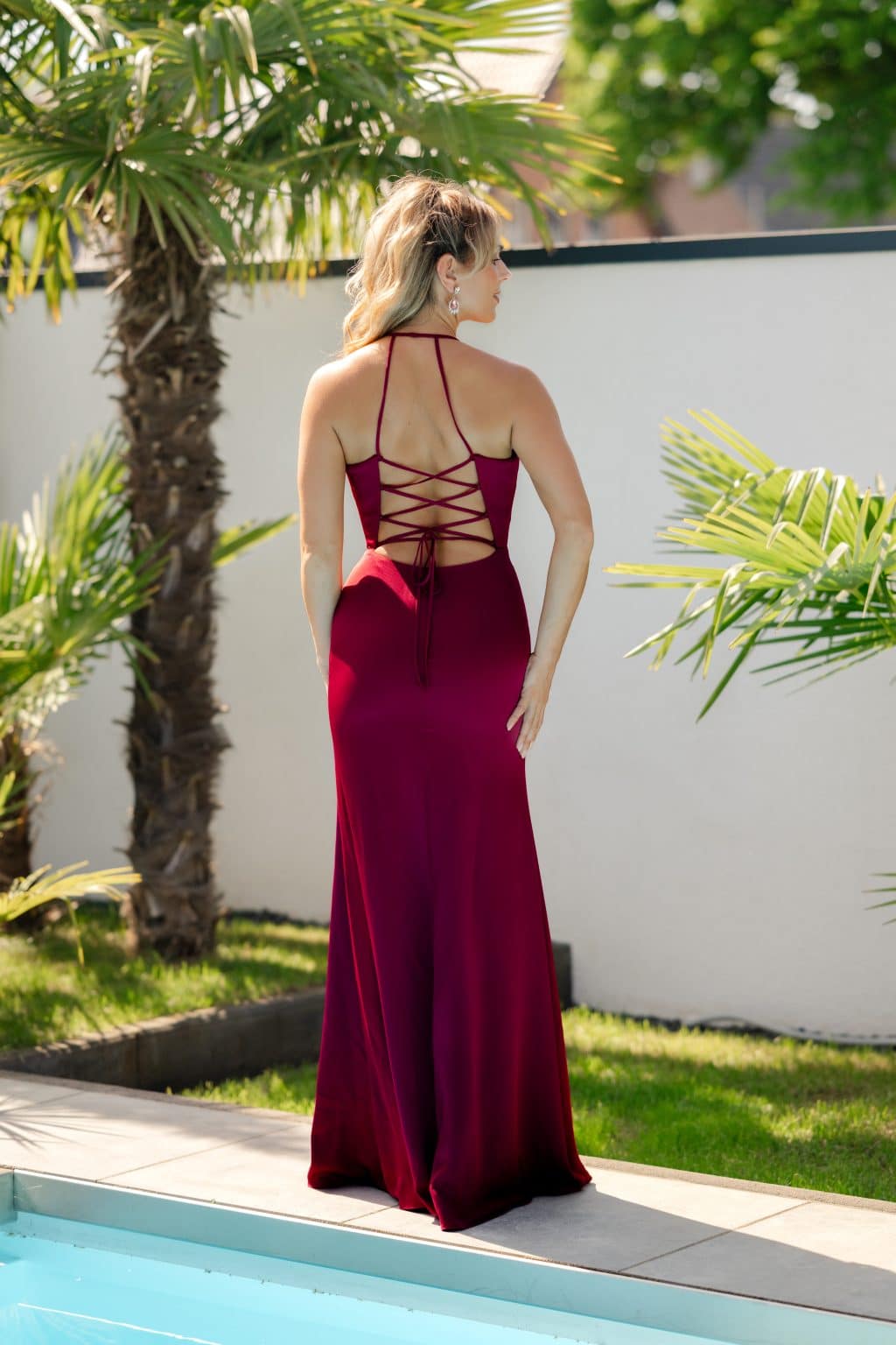 Das Fleur-Kleid strahlt schlichte Eleganz aus. Das Kleid besitzt einen wunderschönen Herz-Ausschnitt und einen beeindruckenden offenen Rücken mit Schnürung, die romantisch wie schick zugleich wirkt. Das Kleid schmiegt sich schön an und läuft fließend aus, was eine elegante und feminine Silhouette erzeugt.