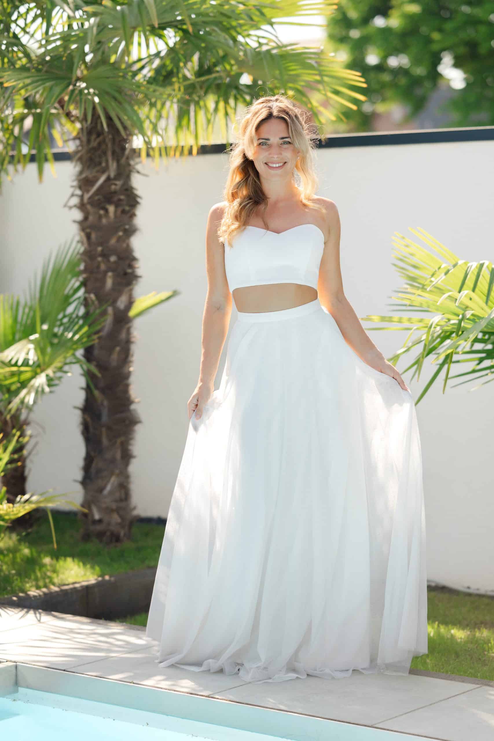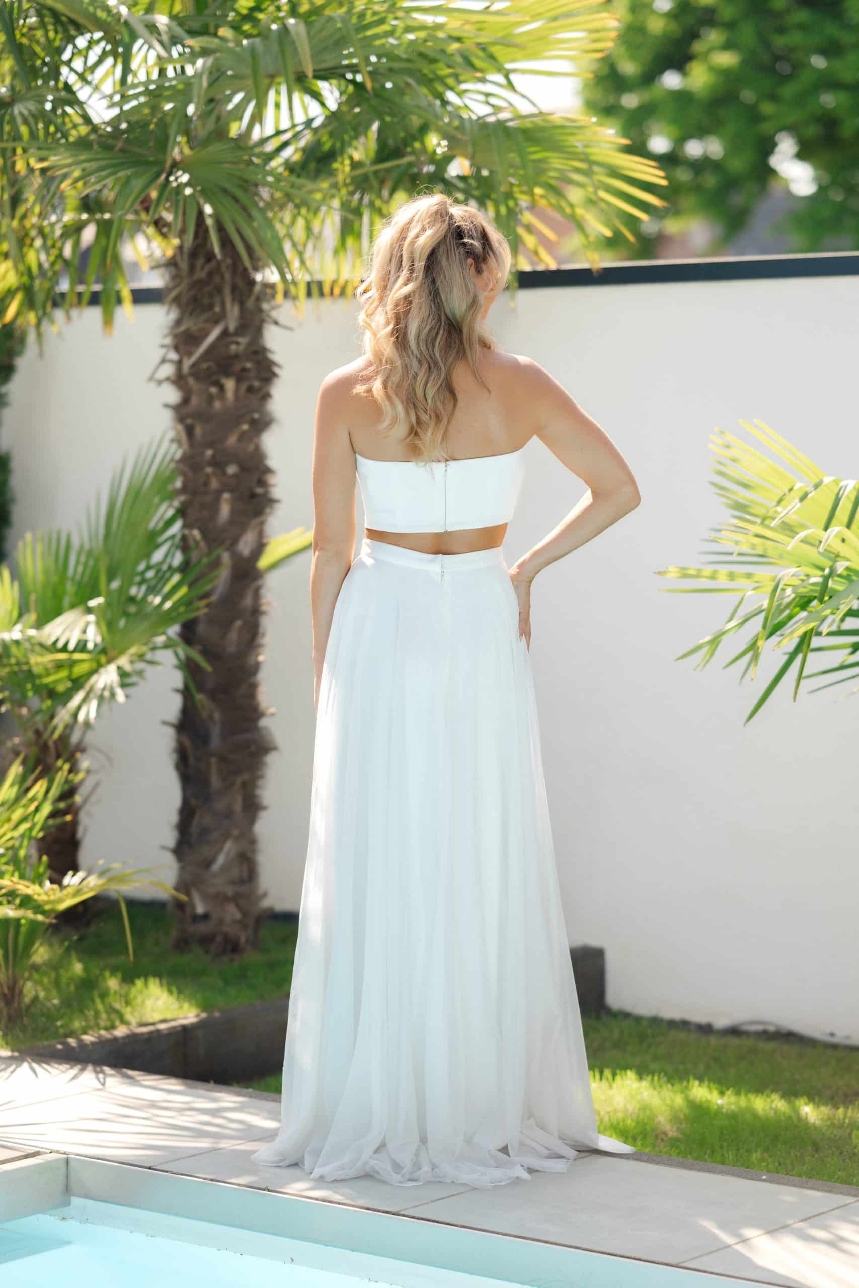 Das Mia-Top und der Talia-Rock bilden zusammen ein wunderschönes zwei-teiliges Braut-Outfit. Das trägerlose Crepe -Top mit dezentem Herz-Ausschnitt betont elegant die Schultern und das Decollete. Der Talia-Rock ist leicht und weiblich, aus leichtem Chiffon, das bei jedem Schritt sich spielerisch mitbewegt. Die hohe Taille schafft eine wunderbare Silhouette und lässt den Top perfekt zur Geltung kommen.